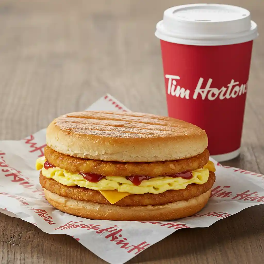 The Tim Hortons Farmer’s Breakfast Sandwich is a hearty way to start your morning. It’s made with a fresh-cracked egg, your choice of crispy bacon or juicy sausage, and a slice of melted cheese, all served on a soft biscuit, English muffin, or toasted bun. Every bite is warm, cheesy, and filling, making it one of the most popular breakfast items on the Tim Hortons menu in Canada.